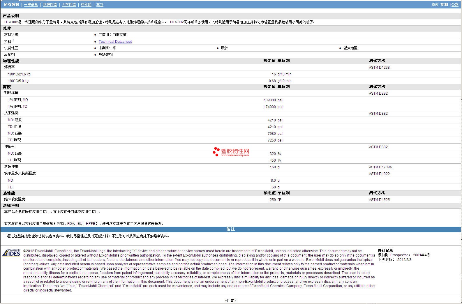更多 ExxonMobil AES HDPE HTA 002 物性表报价,图片、材质证明、UL黄卡、物质安全资料表(MSDS)等可来电咨询赵先生:13424755533或QQ: 27660005