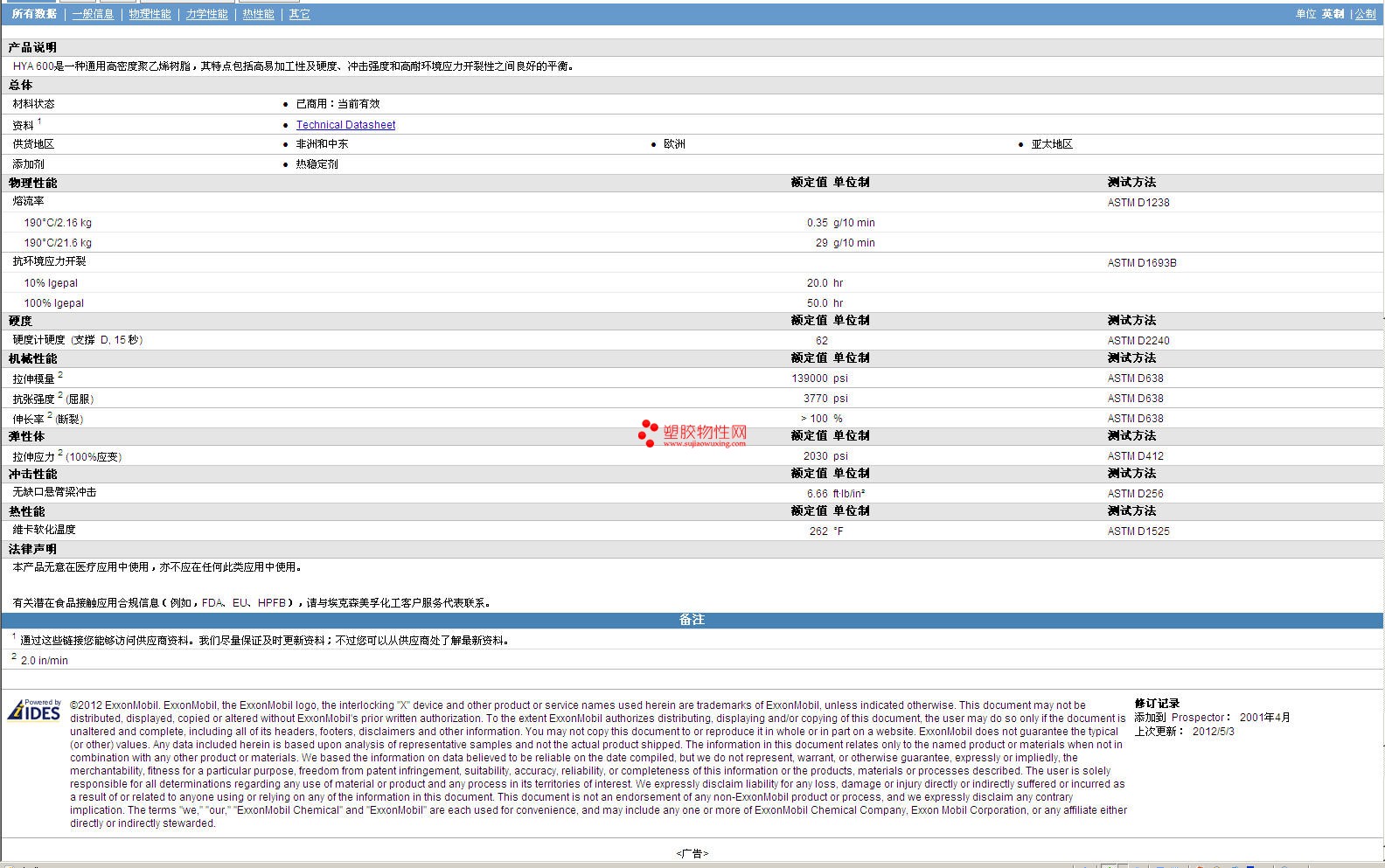 需了解ExxonMobil AES HDPE HYA 600 物性表更多详情,材质证明、ROHS(SGS)报告、物质安全资料表(MSDS)、UL黄卡等,最新行情报价等可来电咨询:赵先生:13424755533或QQ: 27660005