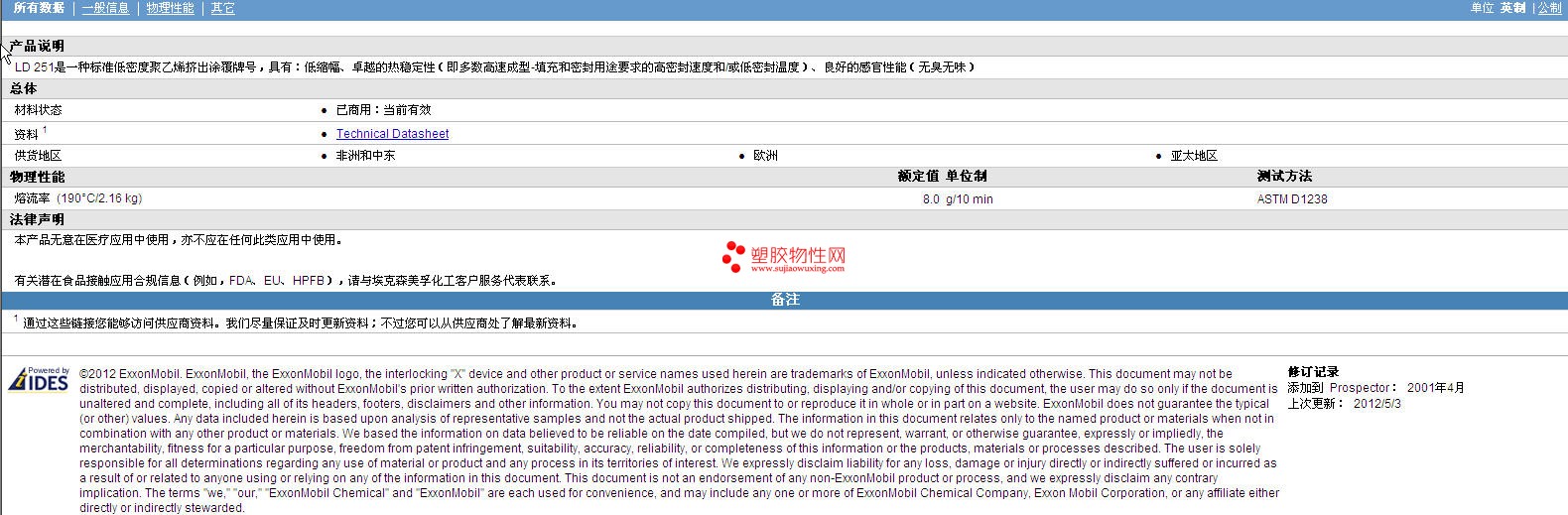 需了解ExxonMobil AES LDPE LD 251 物性表材质证明、ROHS(SGS)报告、物质安全资料表(MSDS)、UL黄卡等可来电咨询:赵先生:13424755533或QQ: 27660005