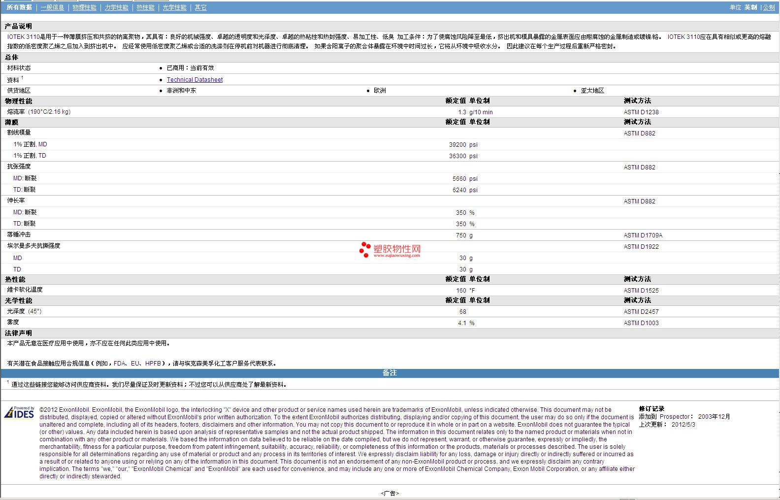 需了解Iotek AES Ionomers 3110 物性表材质证明、ROHS(SGS)报告、物质安全资料表(MSDS)、UL黄卡等可来电咨询:赵先生:13424755533或QQ: 27660005