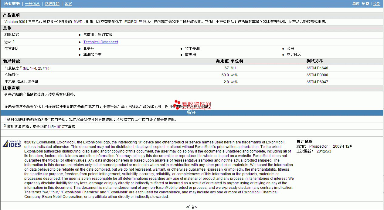 更多Vistalon AES 9301 物性表报价,图片、材质证明、UL黄卡、物质安全资料表(MSDS)等可来电咨询赵先生:13424755533 或QQ:27660005