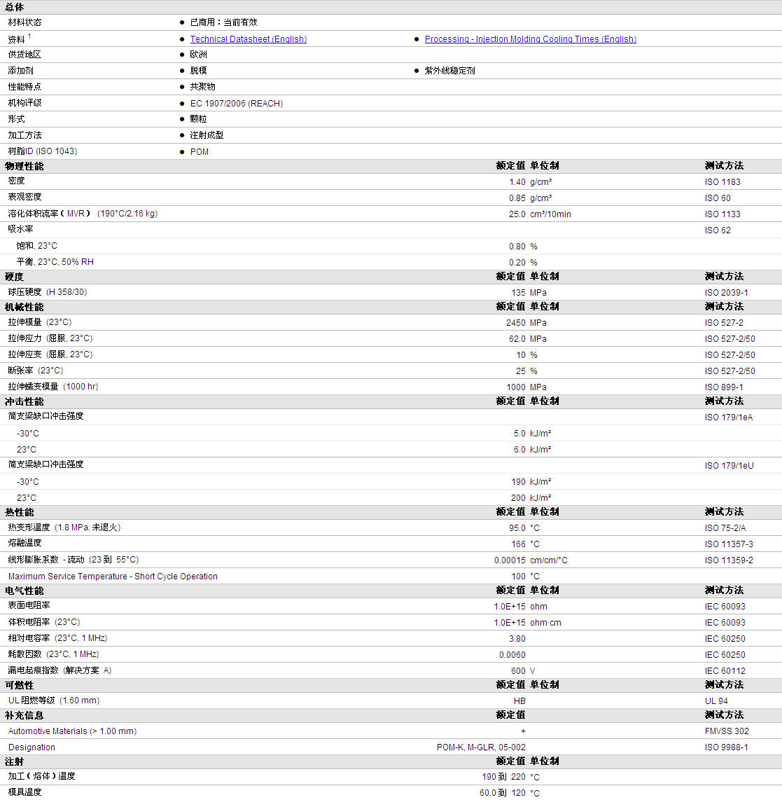 | 溶化体积流率(MVR) (190°C/2.16 kg) | 25.0 | cm³/10min | ISO 1133 |