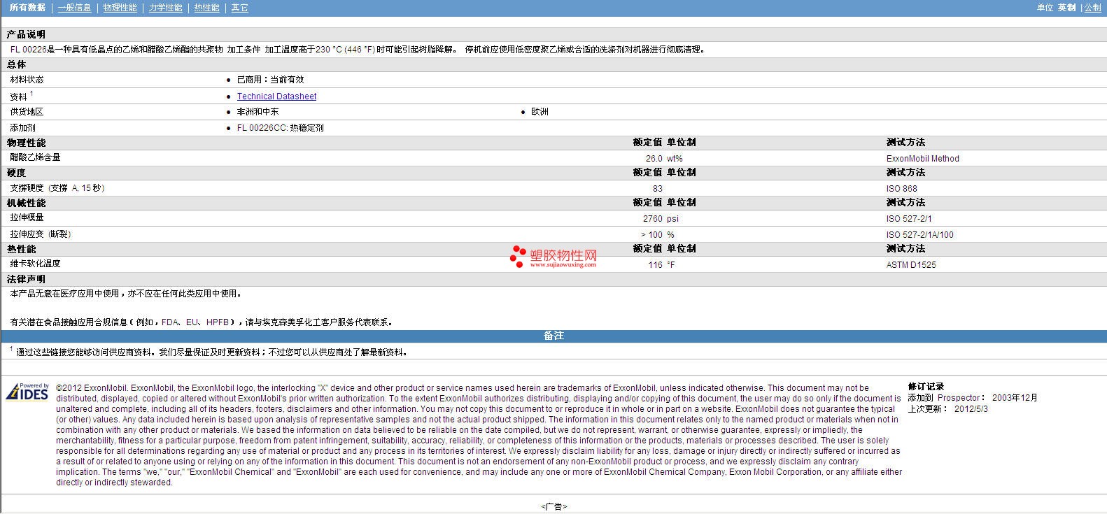 需了解Escorene AES Ultra FL 00226CC 物性表材质证明、ROHS(SGS)报告、物质安全资料表(MSDS)、UL黄卡等可来电咨询:赵先生:13424755533或QQ: 27660005