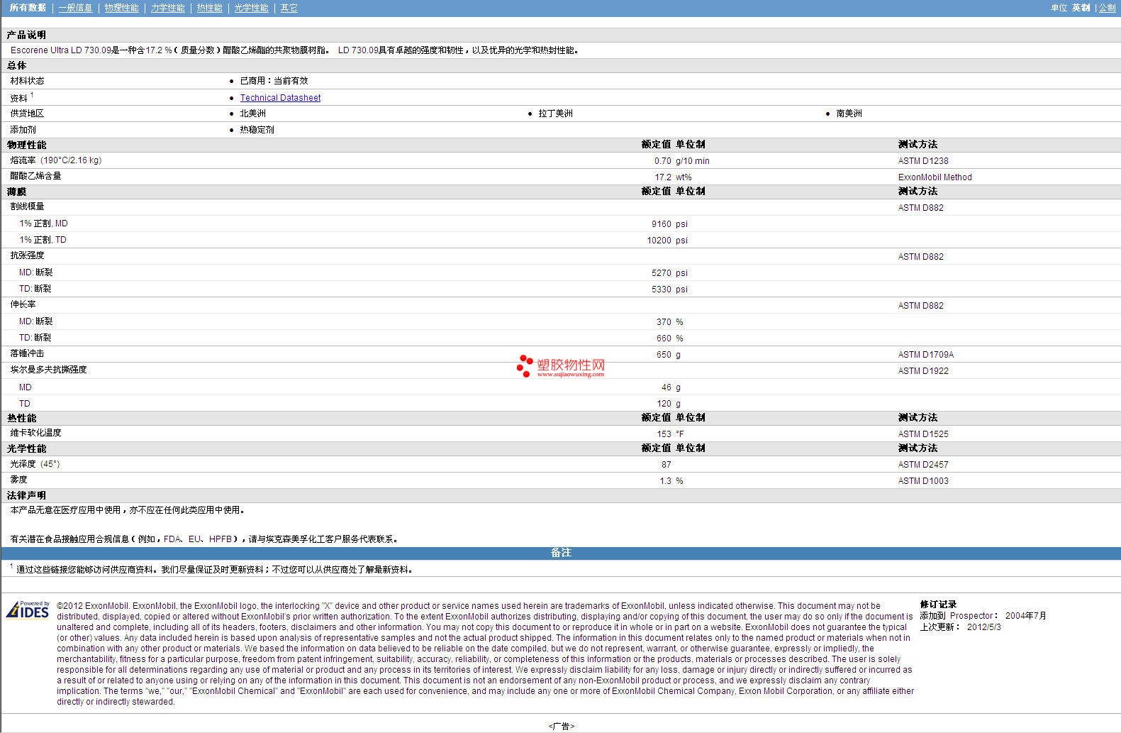 需了解Escorene AES Ultra LD 730.09 Blown 物性表更多详情,材质证明、ROHS(SGS)报告、物质安全资料表(MSDS)、UL黄卡等,最新行情报价等可来电咨询:赵先生:13424755533或QQ: 27660005
