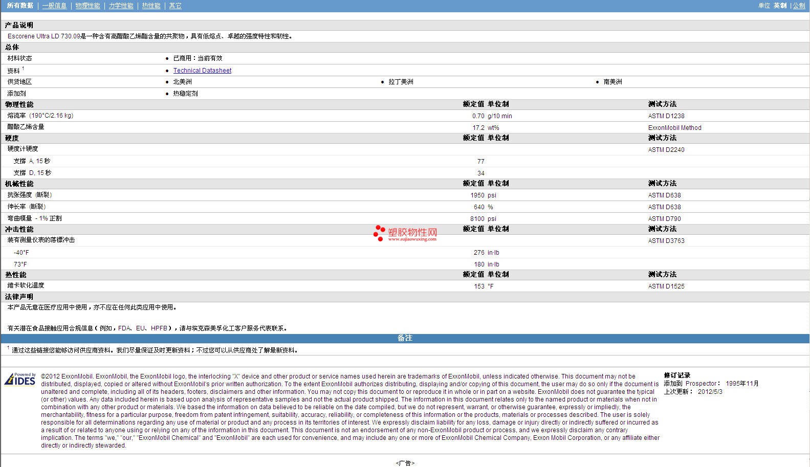需了解Escorene AES Ultra LD 730.09 Molding 物性表更多详情,材质证明、ROHS(SGS)报告、物质安全资料表(MSDS)、UL黄卡等,最新行情报价等可来电咨询:赵先生:13424755533或QQ: 27660005
