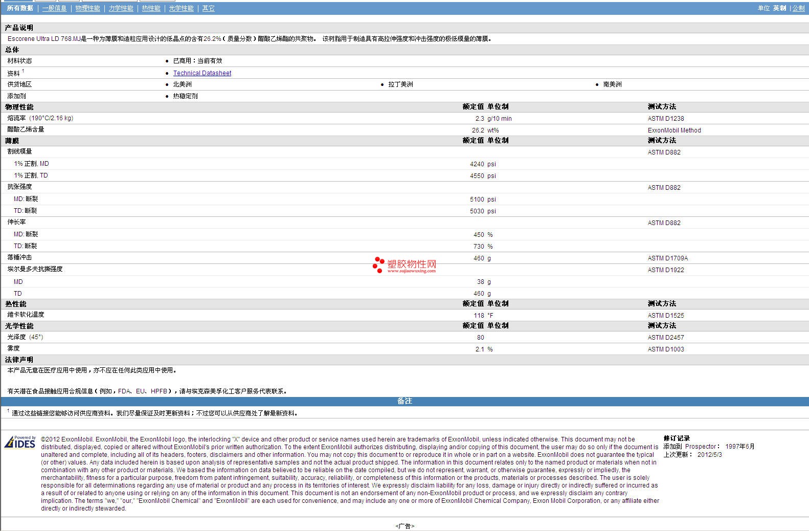 如需了解Escorene AES Ultra LD 768.MJ Blown 物性表更多详情,ROHS(SGS)报告、物质安全资料表(MSDS)、材质证明、UL黄卡等,最新行情报价等可来电咨询:赵先生:13424755533或QQ: 27660005