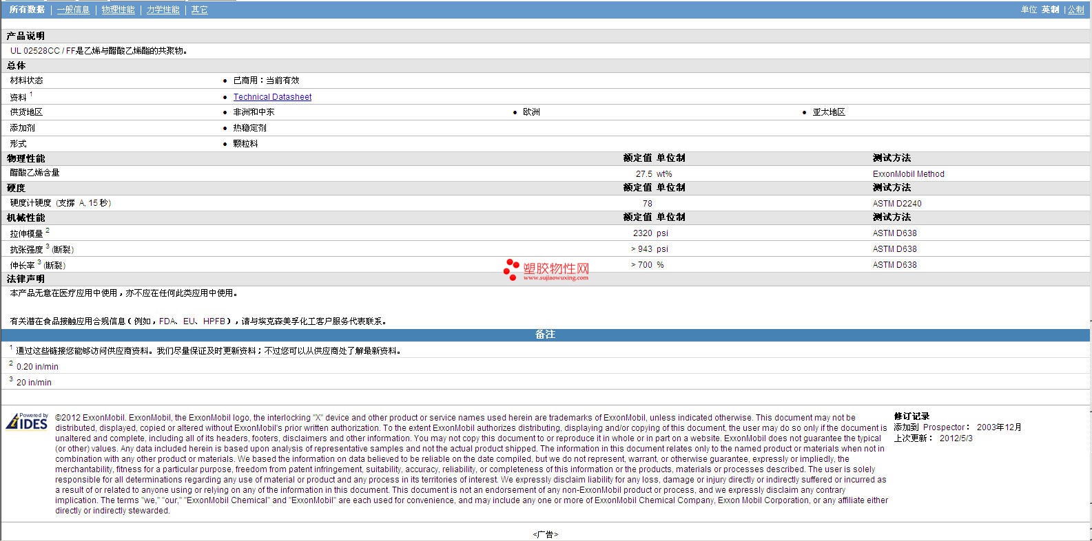 如需了解Escorene AES Ultra UL 02528CC 物性表更多详情,ROHS(SGS)报告、物质安全资料表(MSDS)、材质证明、UL黄卡等,最新行情报价等可来电咨询:赵先生:13424755533或QQ: 27660005