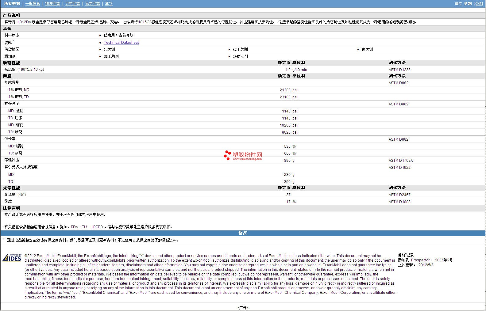 需了解 Exceed AES 1015HA mVLDPE 物性表更多详情,材质证明、ROHS(SGS)报告、物质安全资料表(MSDS)、UL黄卡等,最新行情报价等可来电咨询:赵先生:13424755533或QQ: 27660005