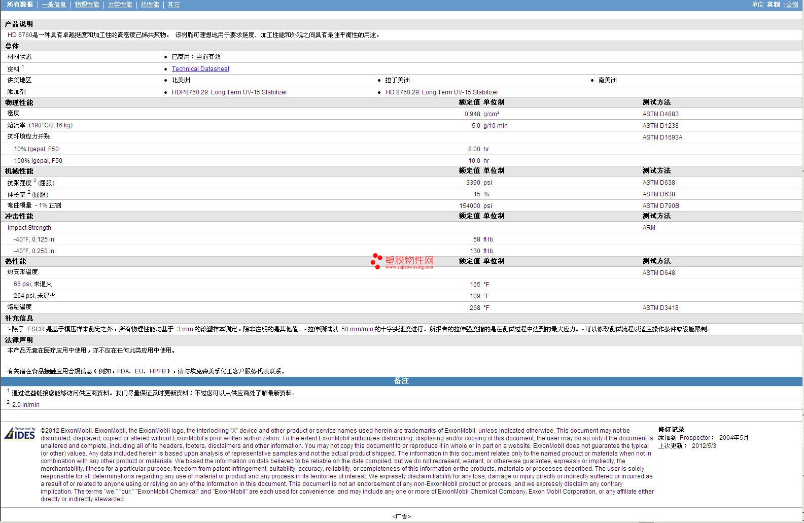 需了解ExxonMobil AES HDPE HD 8760 Series 物性表材质证明、ROHS(SGS)报告、物质安全资料表(MSDS)、UL黄卡等可来电咨询:赵先生:13424755533或QQ: 27660005