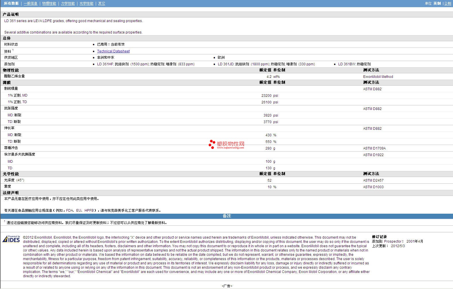 更多ExxonMobil AES LDPE EVA Copolymers LD 361 Series 物性表报价,图片、材质证明、UL黄卡、物质安全资料表(MSDS)等可来电咨询赵先生:13424755533或QQ: 27660005