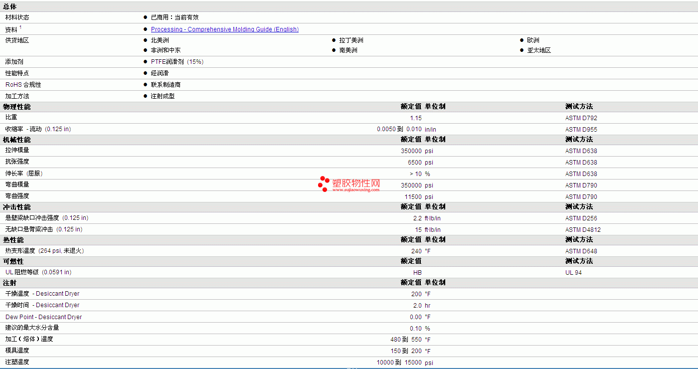 | 拉伸模量 | 350000 | psi | ASTM D638 |