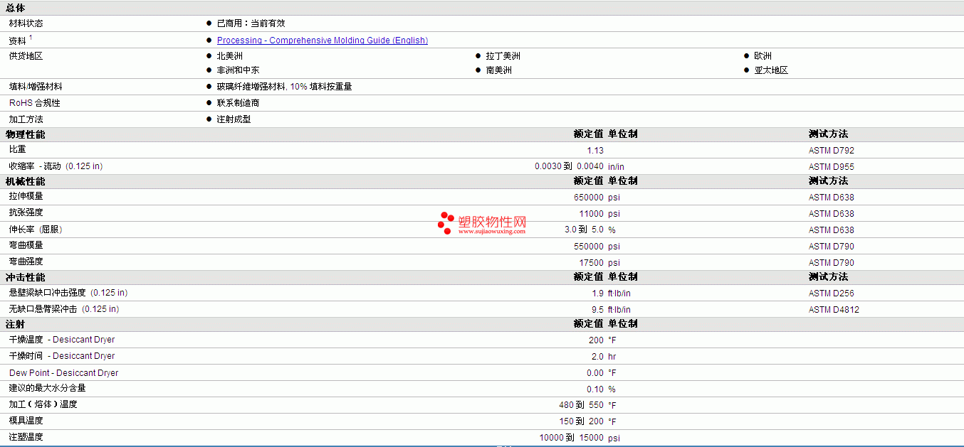 | 弯曲模量 | 550000 | psi | ASTM D790 |