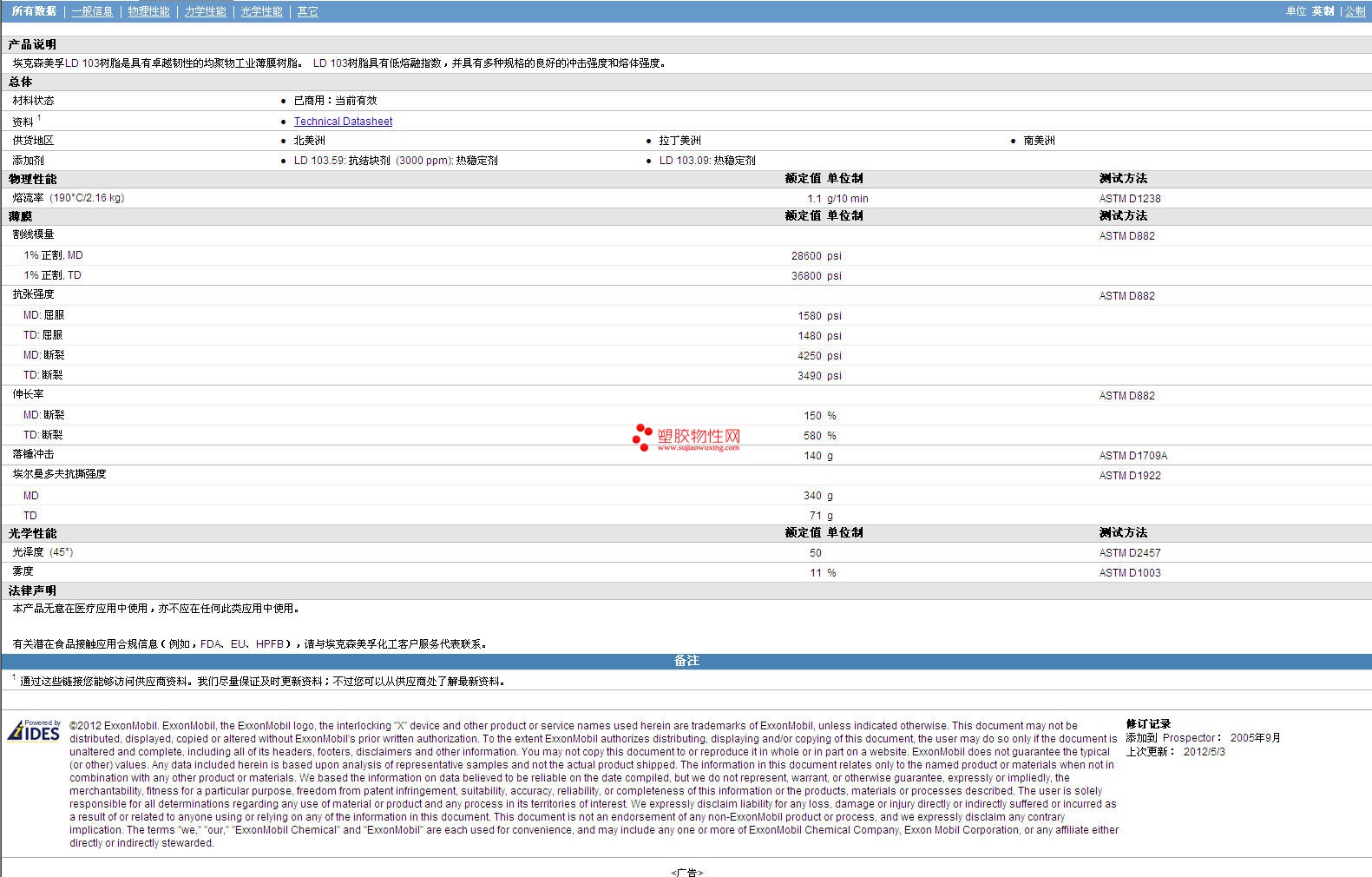 如需了解ExxonMobil AES LDPE LD 103 Series 物性表更多详情,ROHS(SGS)报告、物质安全资料表(MSDS)、材质证明、UL黄卡等,最新行情报价等可来电咨询:赵先生:13424755533或QQ: 27660005