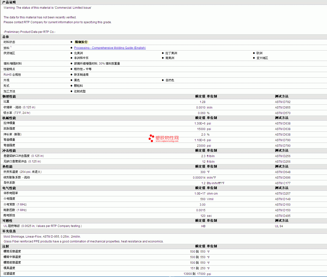 | 拉伸模量 | 1.30E+6 | psi | ASTM D638 |