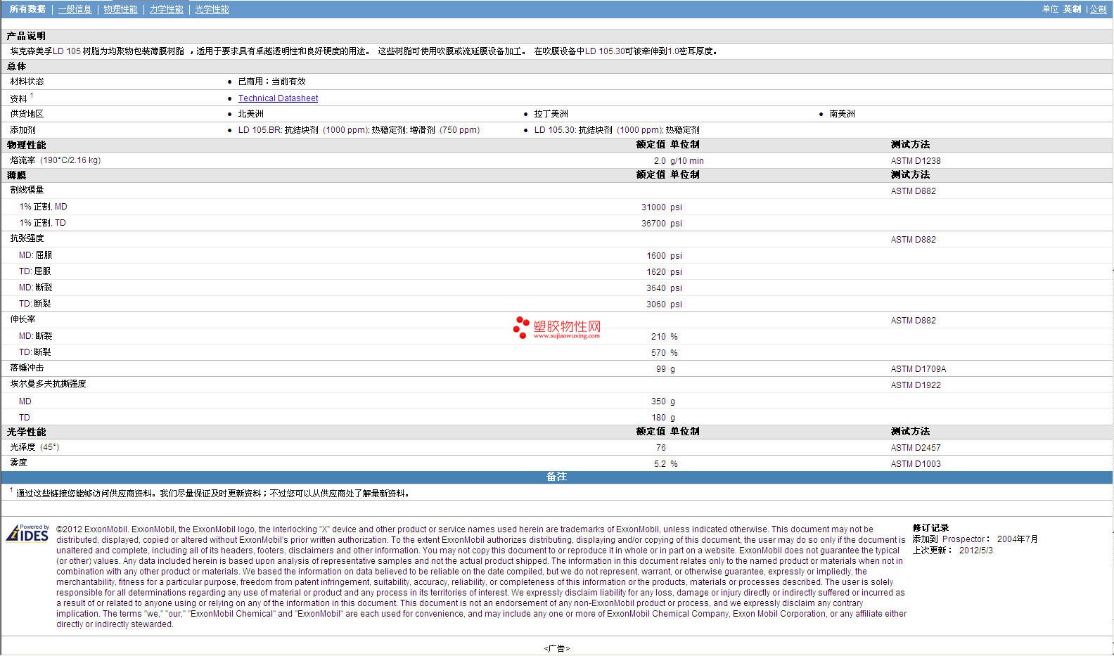 更多 ExxonMobil AES LDPE LD 105 Series 物性表报价,图片、材质证明、UL黄卡、物质安全资料表(MSDS)等,最新行情报价等可来电咨询赵先生:13424755533或QQ: 27660005