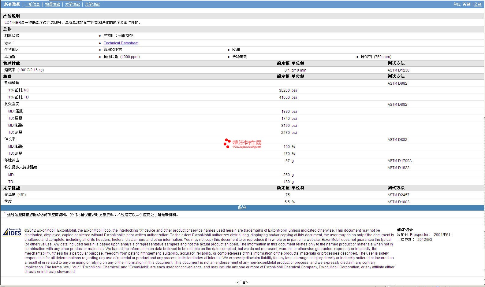 ExxonMobil AES LDPE LD 144BR 物性表