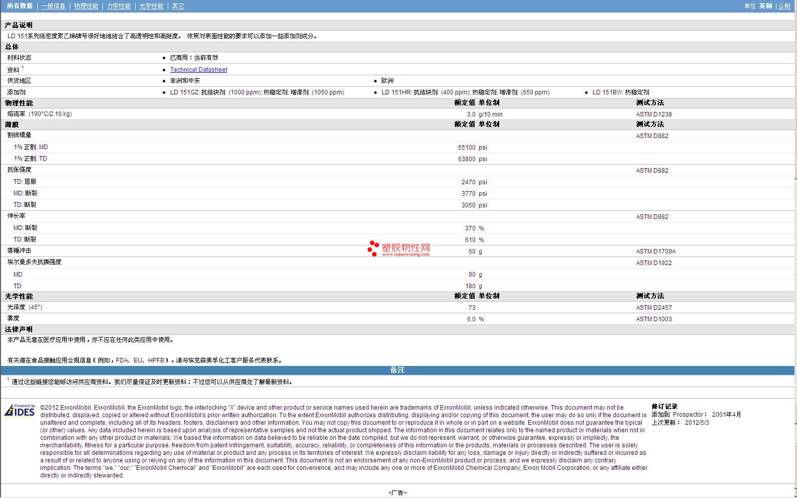 更多ExxonMobil AES LDPE LD 151 Series 物性表报价,图片、材质证明、UL黄卡、物质安全资料表(MSDS)等可来电咨询赵先生:13424755533或QQ: 27660005
