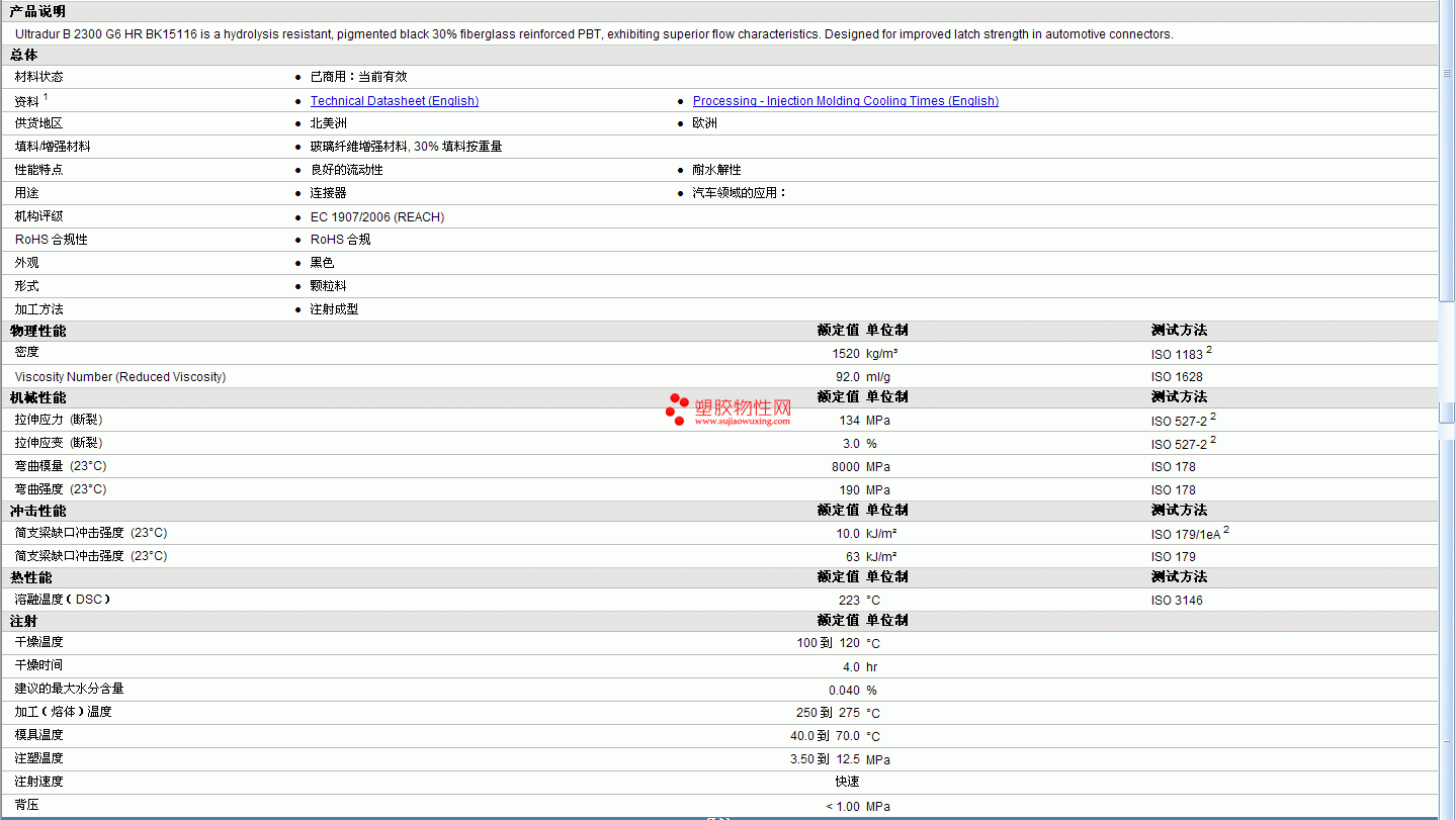 Ultradur pbt B 2300 G6 HR BK15116物性表如图