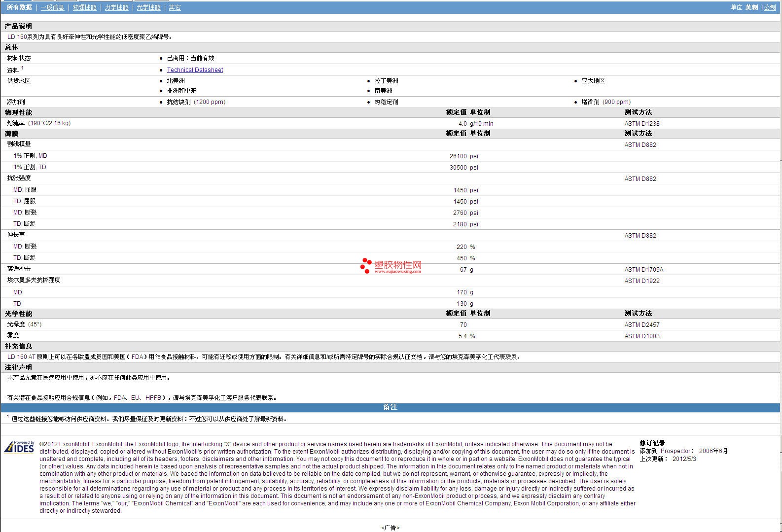 如需了解 ExxonMobil AES LDPE LD 160AT 物性表更多详情,ROHS(SGS)报告、物质安全资料表(MSDS)、材质证明、UL黄卡等,最新行情报价等可来电咨询:赵先生:13424755533或QQ: 2766000