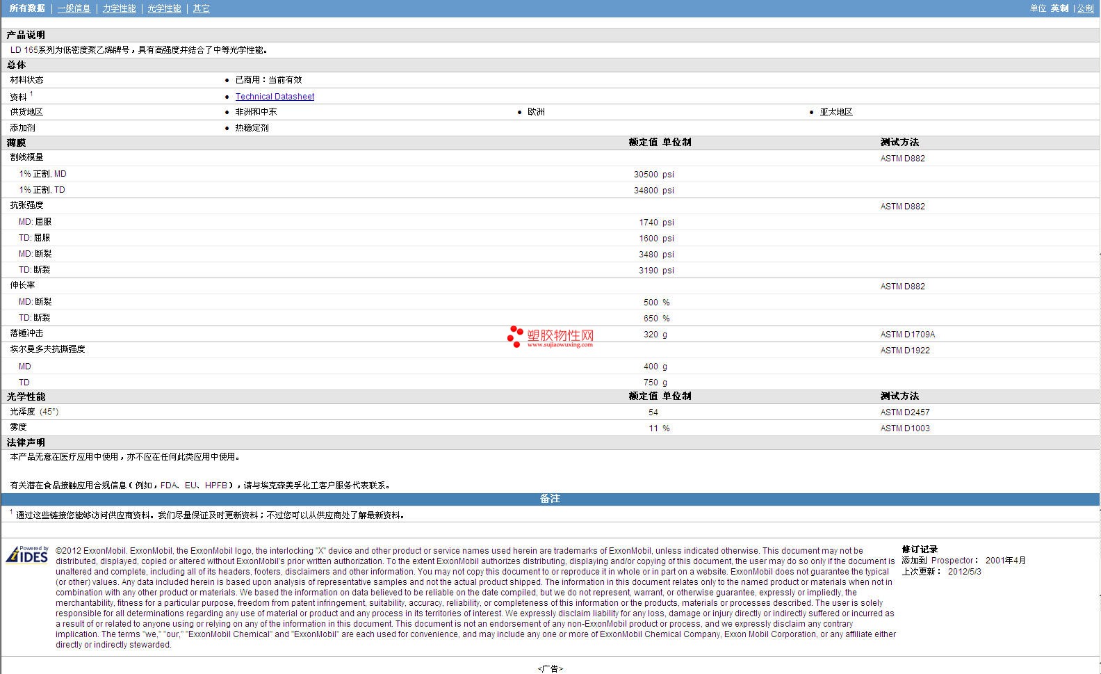 ExxonMobil AES LDPE LD 165BW1 详细情况如图