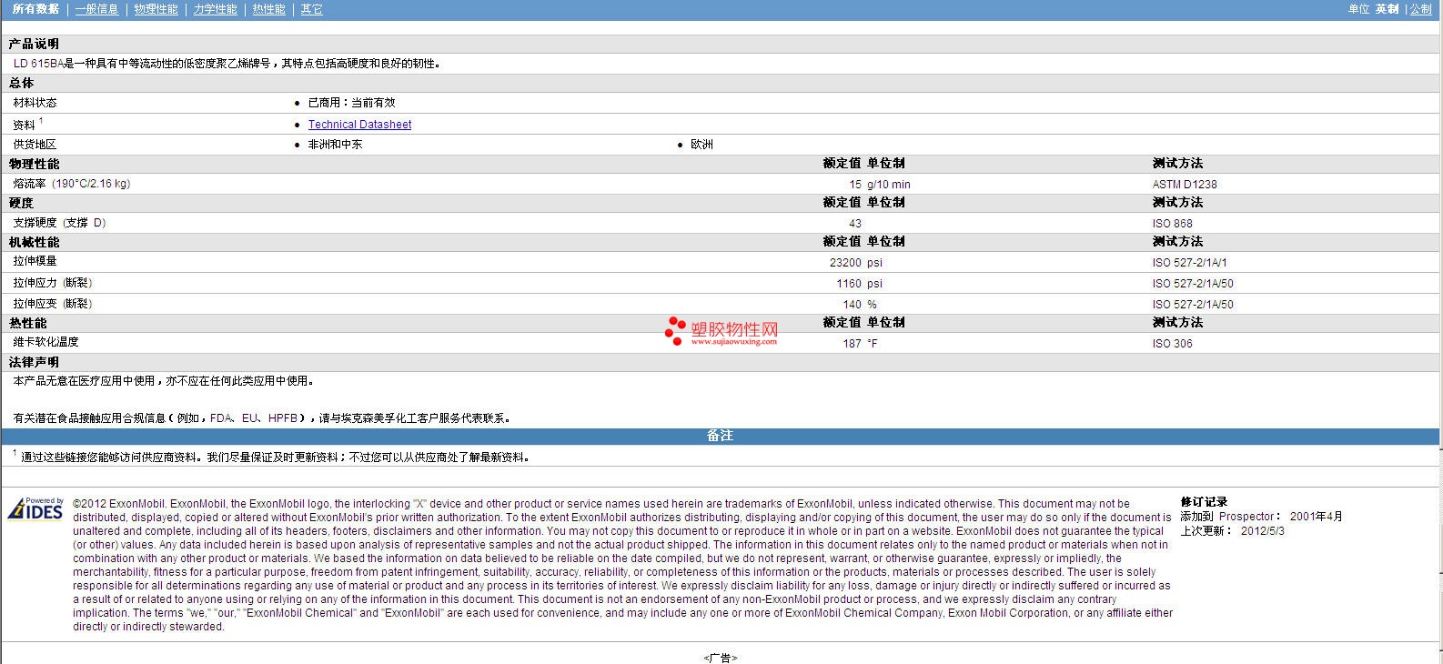 如需了解ExxonMobil AES LDPE LD 615BA 物性表更多详情,ROHS(SGS)报告、物质安全资料表(MSDS)、材质证明、UL黄卡等,最新行情报价等可来电咨询:赵先生:13424755533或QQ: 27660005