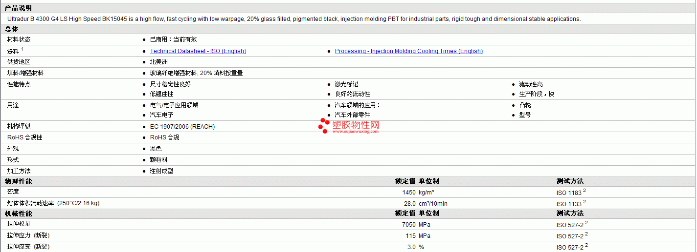 UltradurB 4300 G4 LS High Speed BK15045物性表 见图片