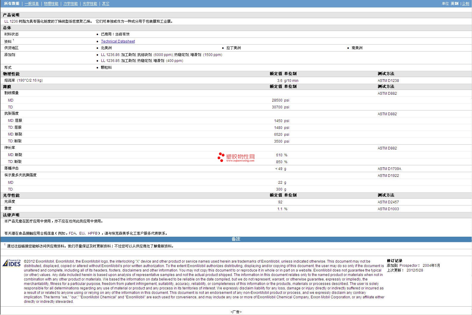 需了解ExxonMobil AES LLDPE LL 1236 Series 物性表更多详情,材质证明、ROHS(SGS)报告、物质安全资料表(MSDS)、UL黄卡等,最新行情报价等可来电咨询:赵先生:13424755533或QQ: 27660005