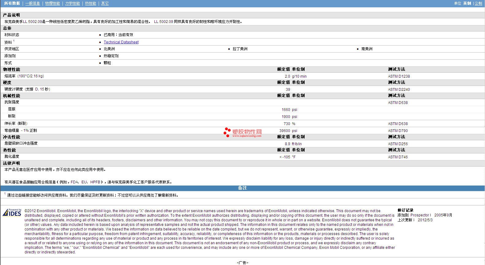 更多ExxonMobil AES LLDPE LL 5002.09 物性表报价,图片、材质证明、UL黄卡、物质安全资料表(MSDS)等,最新行情报价等可来电咨询赵先生:13424755533或QQ: 27660005
