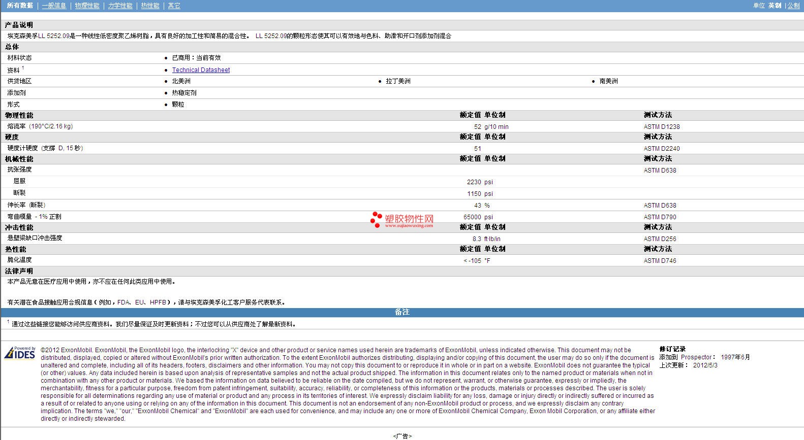 需了解 ExxonMobil AES LLDPE LL 5252.09 物性表材质证明、ROHS(SGS)报告、物质安全资料表(MSDS)、UL黄卡等可来电咨询:赵先生:13424755533或QQ: 27660005