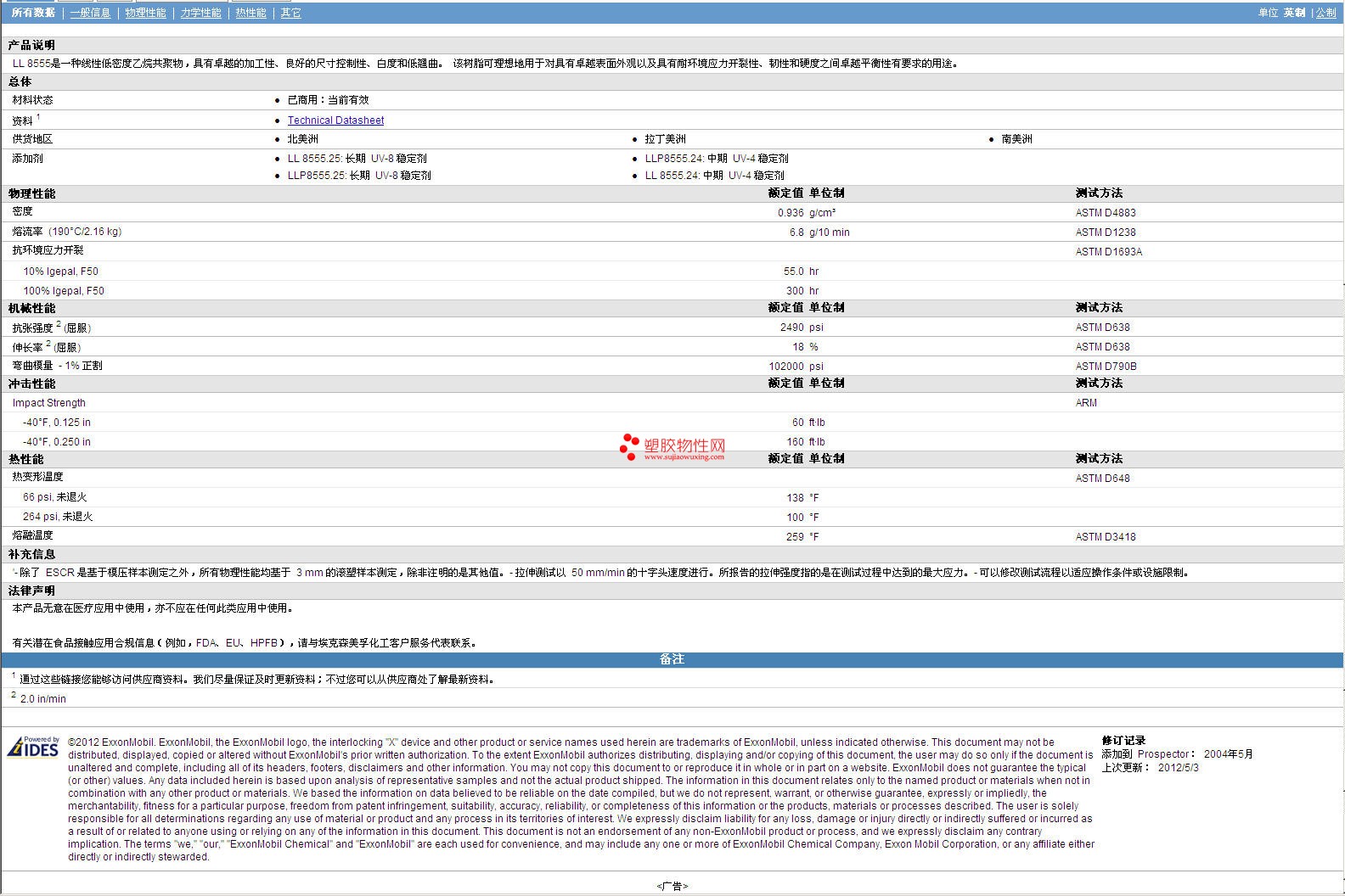 如需了解ExxonMobil AES LLDPE LL 8555 Series 物性表更多详情,ROHS(SGS)报告、物质安全资料表(MSDS)、材质证明、UL黄卡等,最新行情报价等可来电咨询:赵先生:13424755533或QQ: 27660005