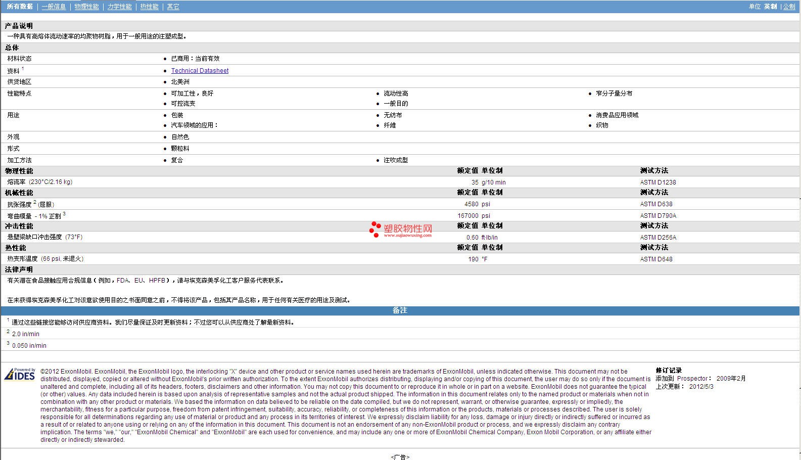 需了解ExxonMobil AES PP1105E1 物性表材质证明、ROHS(SGS)报告、物质安全资料表(MSDS)、UL黄卡等可来电咨询:赵先生:13424755533或QQ: 27660005