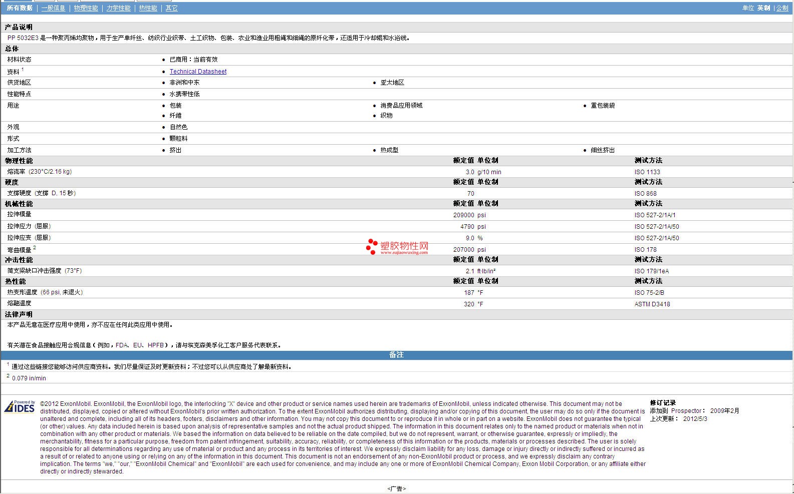 需了解ExxonMobil AES PP5032E3 物性表材质证明、ROHS(SGS)报告、物质安全资料表(MSDS)、UL黄卡等可来电咨询:赵先生:13424755533或QQ: 27660005