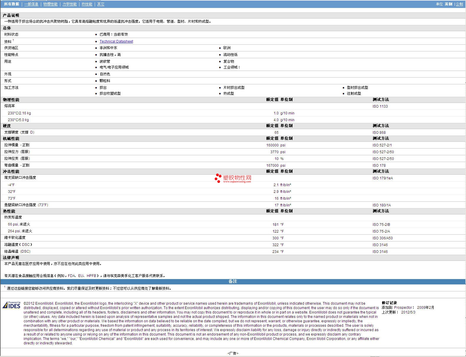 更多ExxonMobil AES PP7011L1 物性表报价,图片、材质证明、UL黄卡、物质安全资料表(MSDS)等可来电咨询赵先生:13424755533或QQ: 27660005