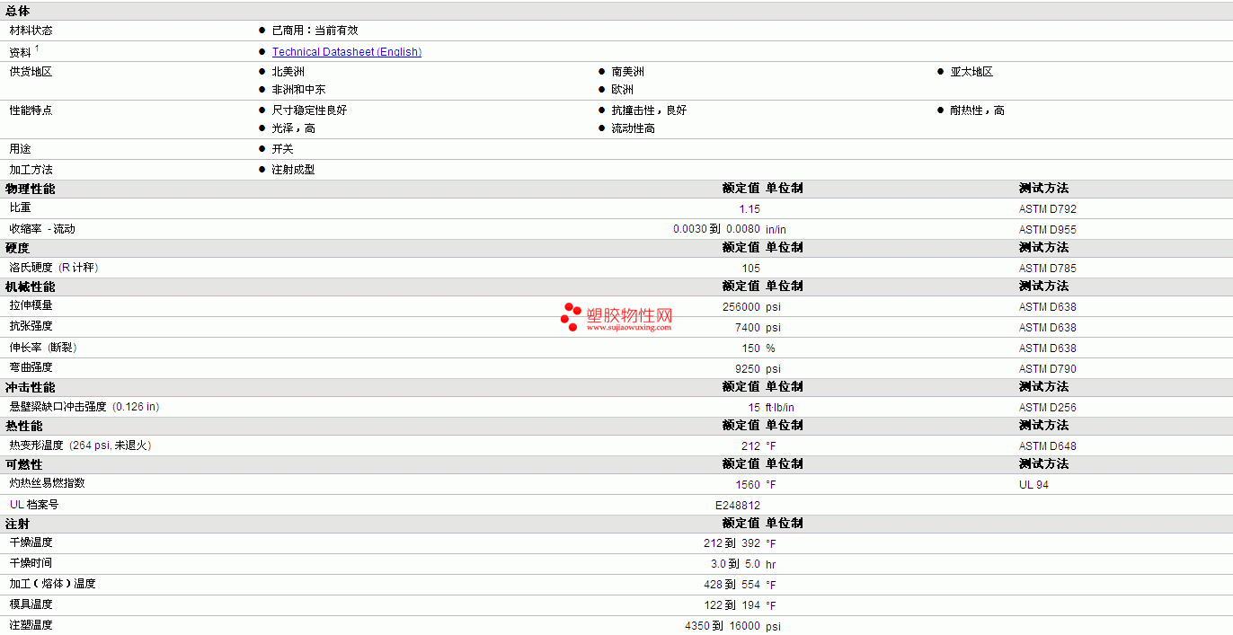| 拉伸模量 | 256000 | psi | ASTM D638 |