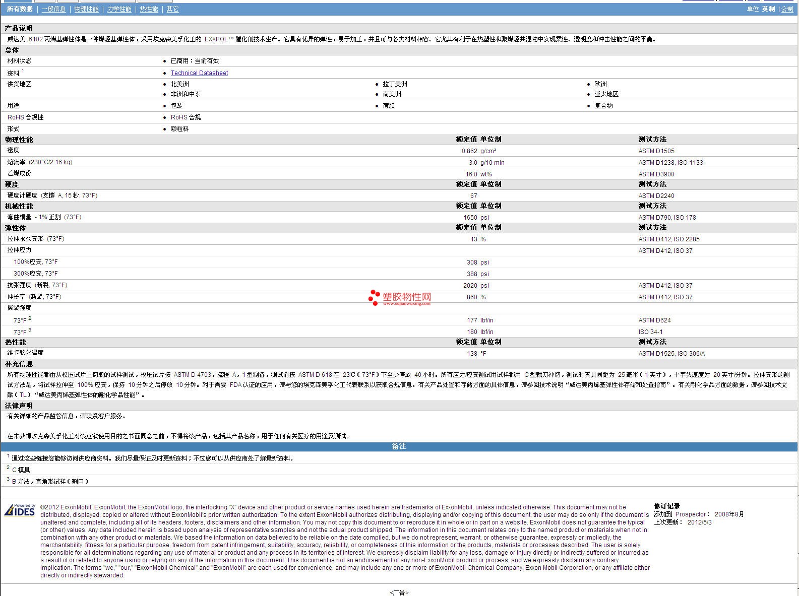 如需了解Vistamaxx AES 6102 物性表更多详情,ROHS(SGS)报告、物质安全资料表(MSDS)、材质证明、UL黄卡等,最新行情报价等可来电咨询:赵先生:13424755533或QQ: 27660005