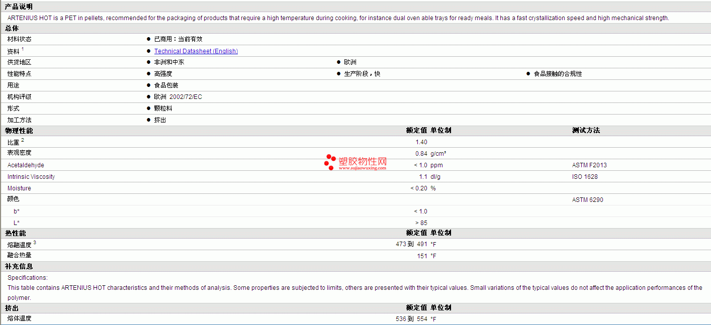 Artenius PET HOT 物性表 详细情况如图