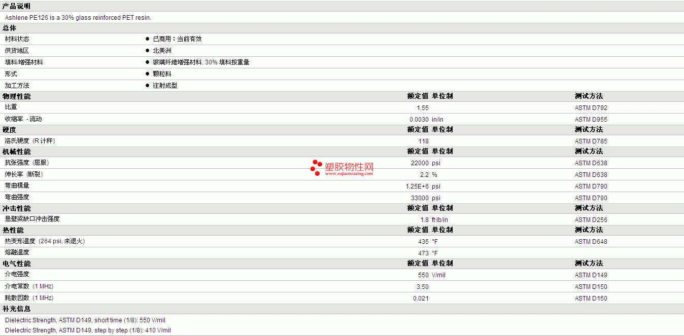 | 抗张强度 (屈服) | 22000 | psi | ASTM D638 |