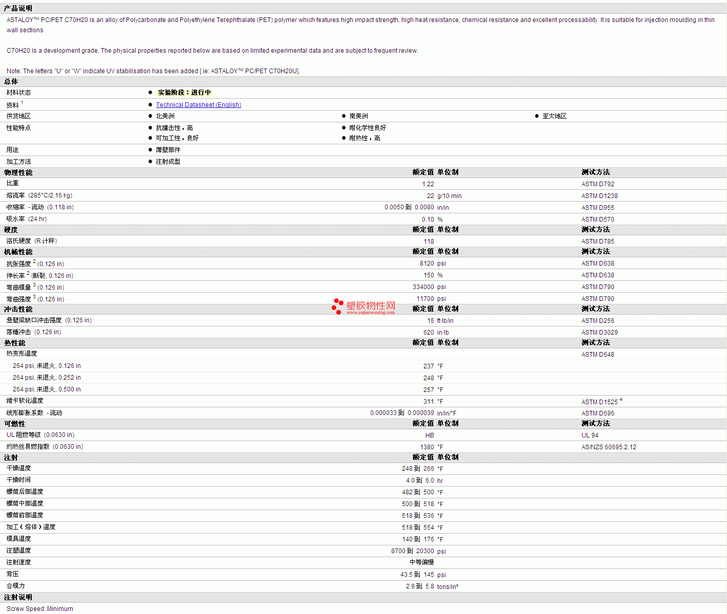 ASTALOY PET PC/PET C70H20 物性表 更多资料见图