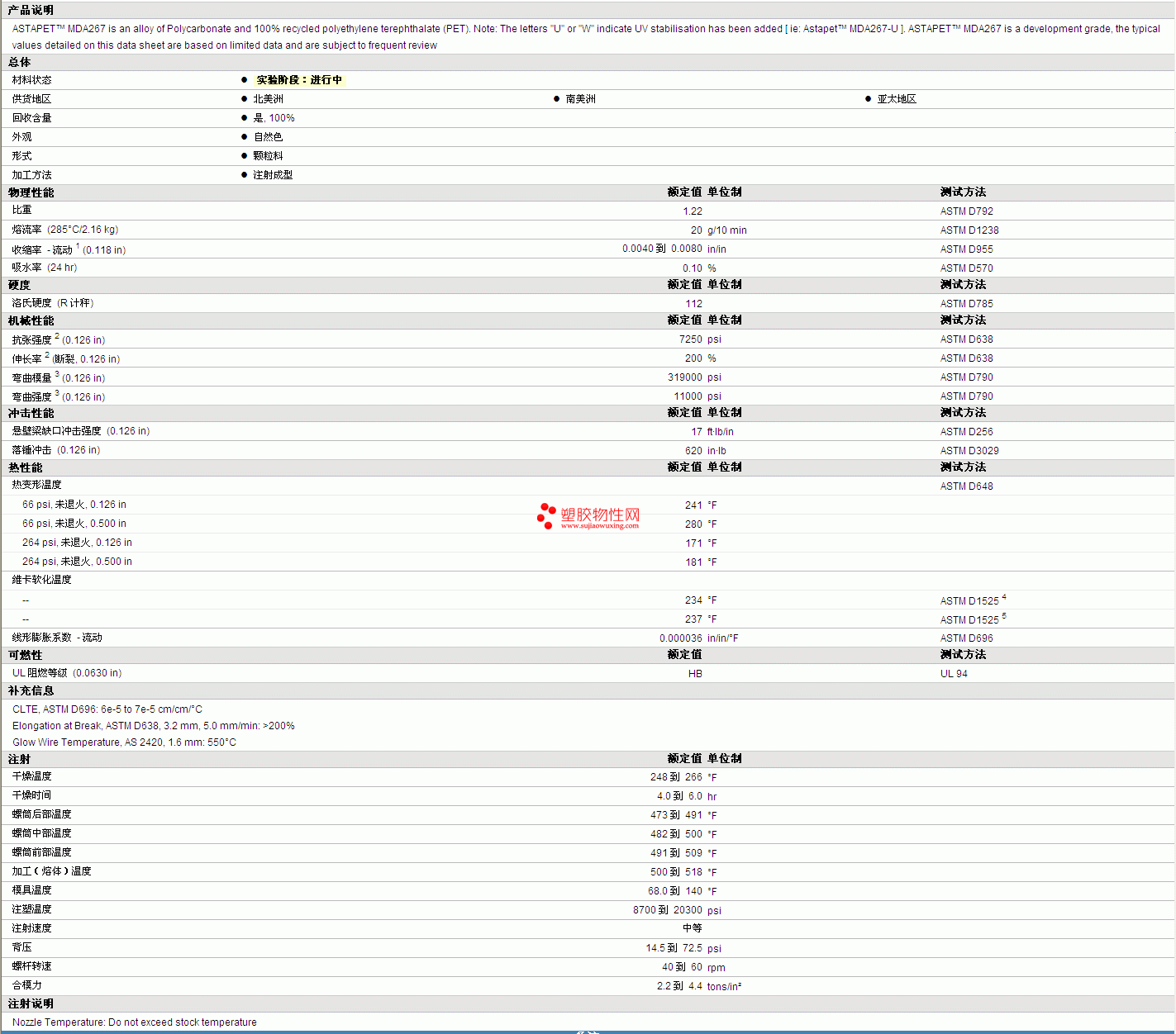 | 收缩率 - 流动 1 (0.118 in) | 0.0040 到 0.0080 | in/in | ASTM D955 |