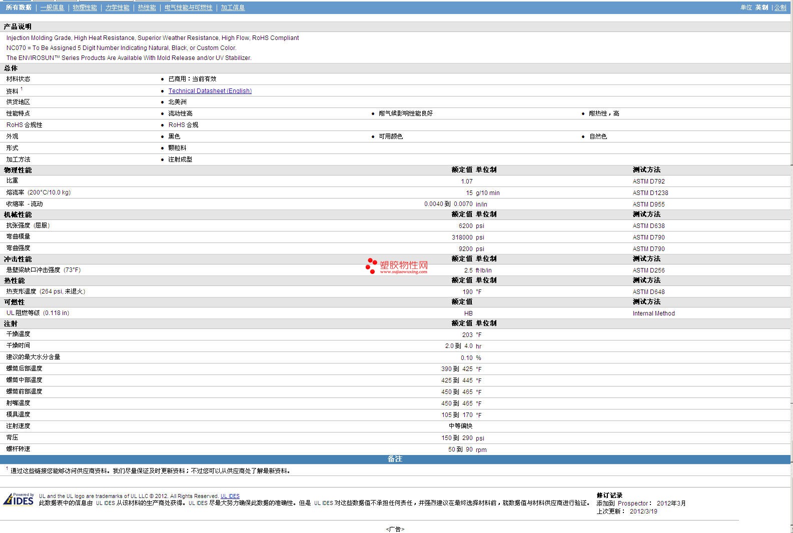 更多 ENVIROSUN ASA ENV31-NC070 物性表报价,图片、材质证明、UL黄卡、物质安全资料表(MSDS)等可来电咨询赵先生:13424755533或QQ: 27660005