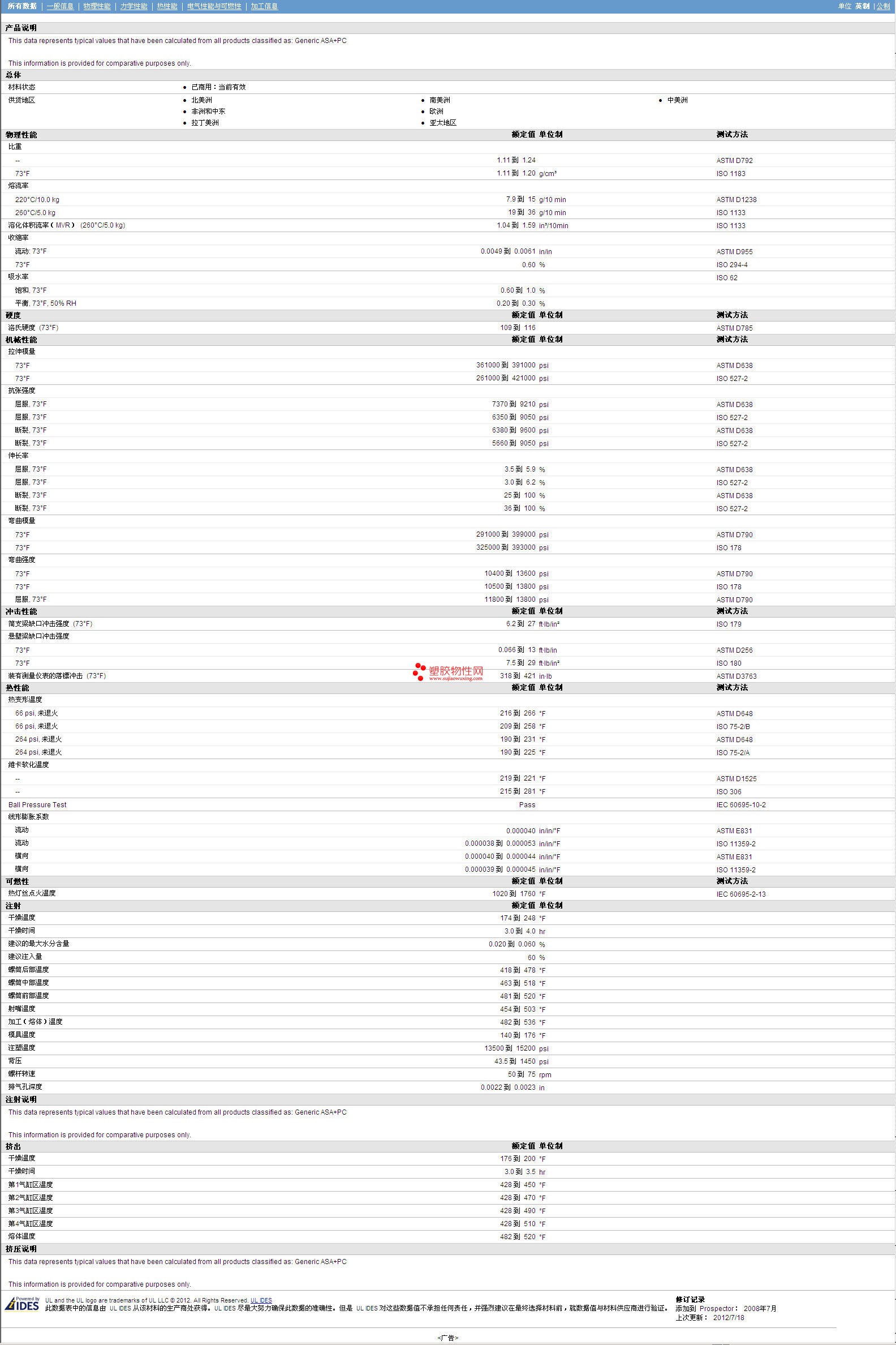 需了解Generic ASA PC 物性表更多详情,材质证明、ROHS(SGS)报告、物质安全资料表(MSDS)、UL黄卡等,最新行情报价等可来电咨询:赵先生:13424755533或QQ: 27660005