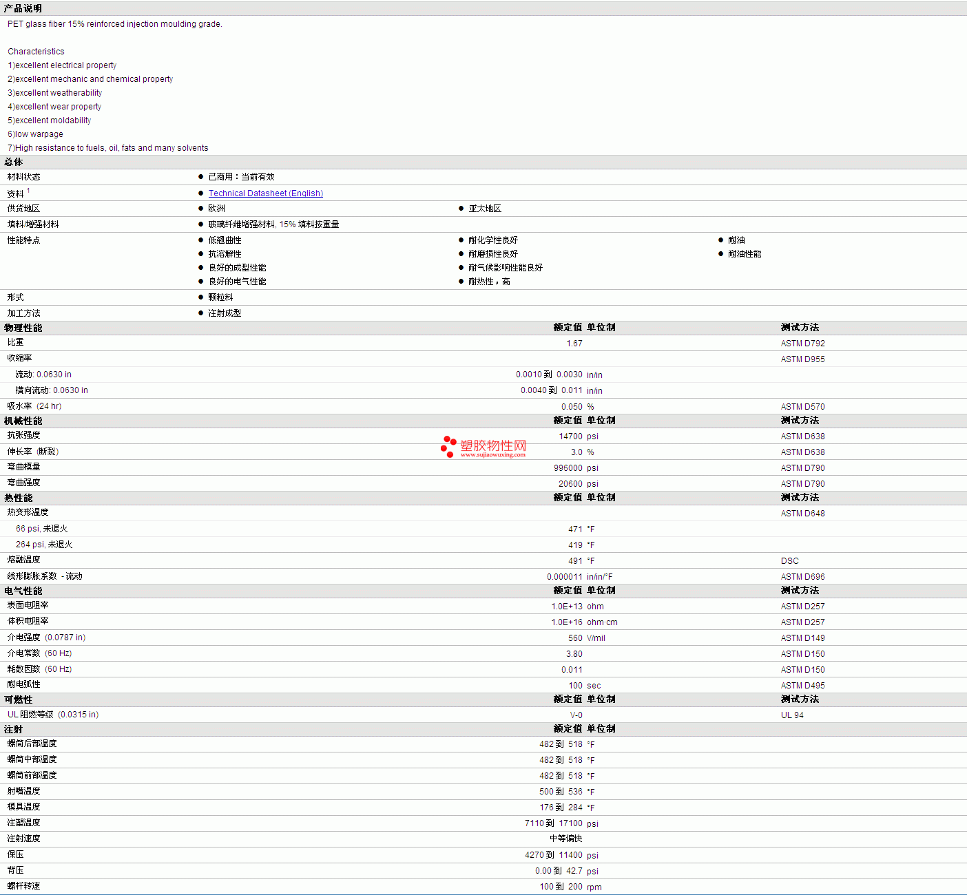 需了解LONGLITE PET 9115-200 物性表更多详情,材质证明、ROHS(SGS)报告、物质安全资料表(MSDS)、UL黄卡等,最新行情报价等可来电咨询:赵先生:13424755533。或QQ:27660005