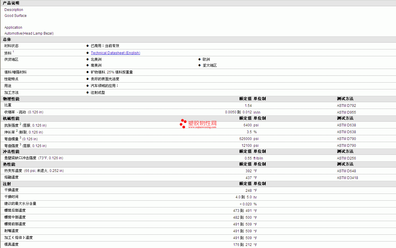 | 收缩率 - 流动 (0.126 in) | 0.0050 到 0.012 | in/in | ASTM D955 |