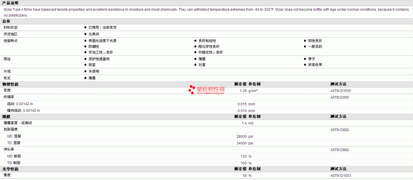 Mylar PET A (142 guage) 物性表 详细情况如图