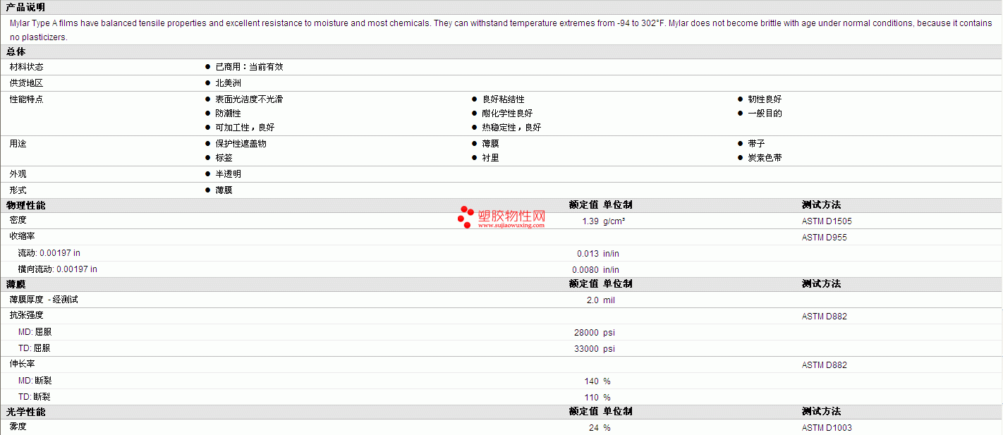更多Mylar PET A (200 guage) 物性表报价,图片、材质证明、UL黄卡、物质安全资料表(MSDS)等可来电咨询赵先生:13424755533。或QQ:27660005