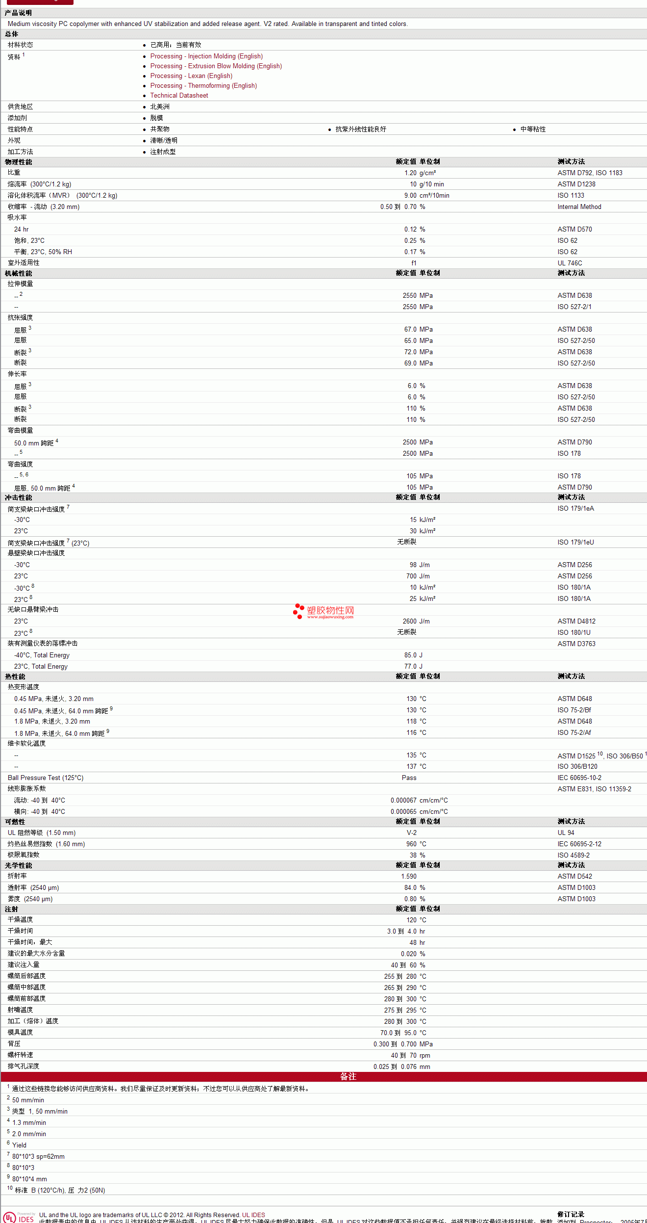 LEXAN pc SLX2432T Resin物性表 见图片