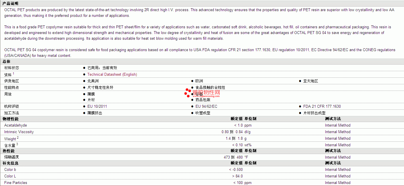 | Intrinsic Viscosity | 0.80 到 0.84 | dl/g | Internal Method |