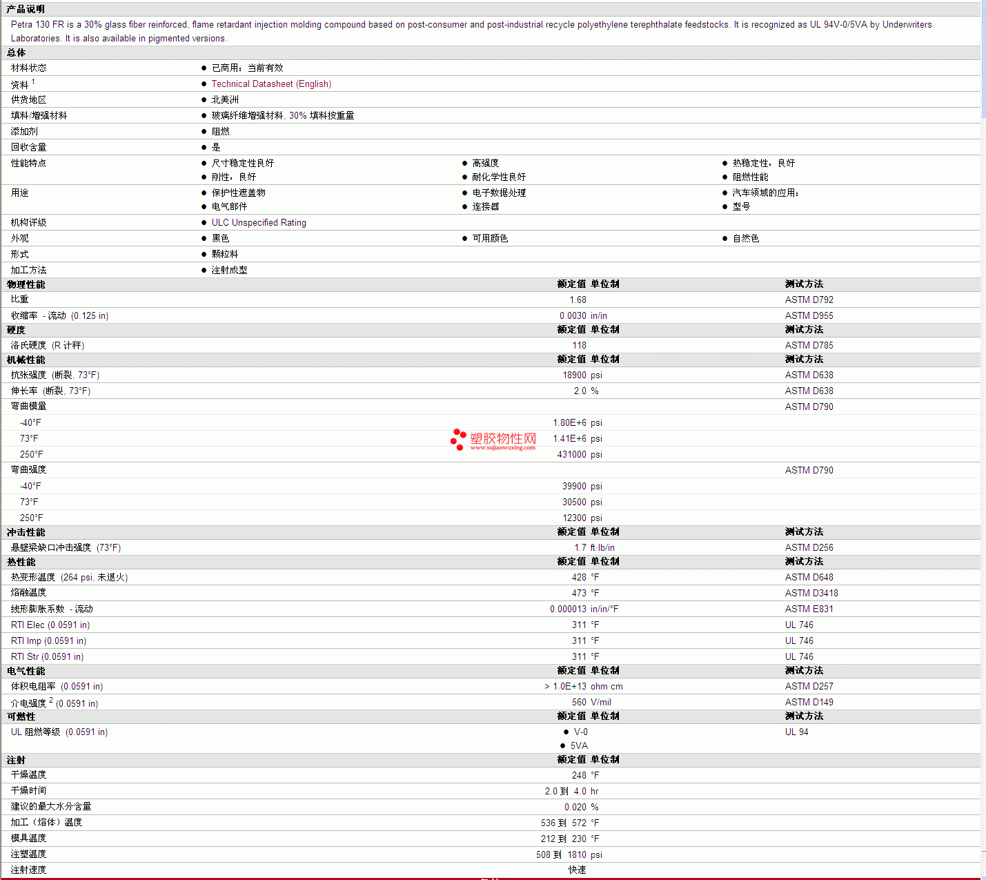 如需了解Petra PET 130 FR 物性表更多详情,ROHS(SGS)报告、物质安全资料表(MSDS)、材质证明、UL黄卡等,最新行情报价等可来电咨询:赵先生:13424755533。或QQ:27660005