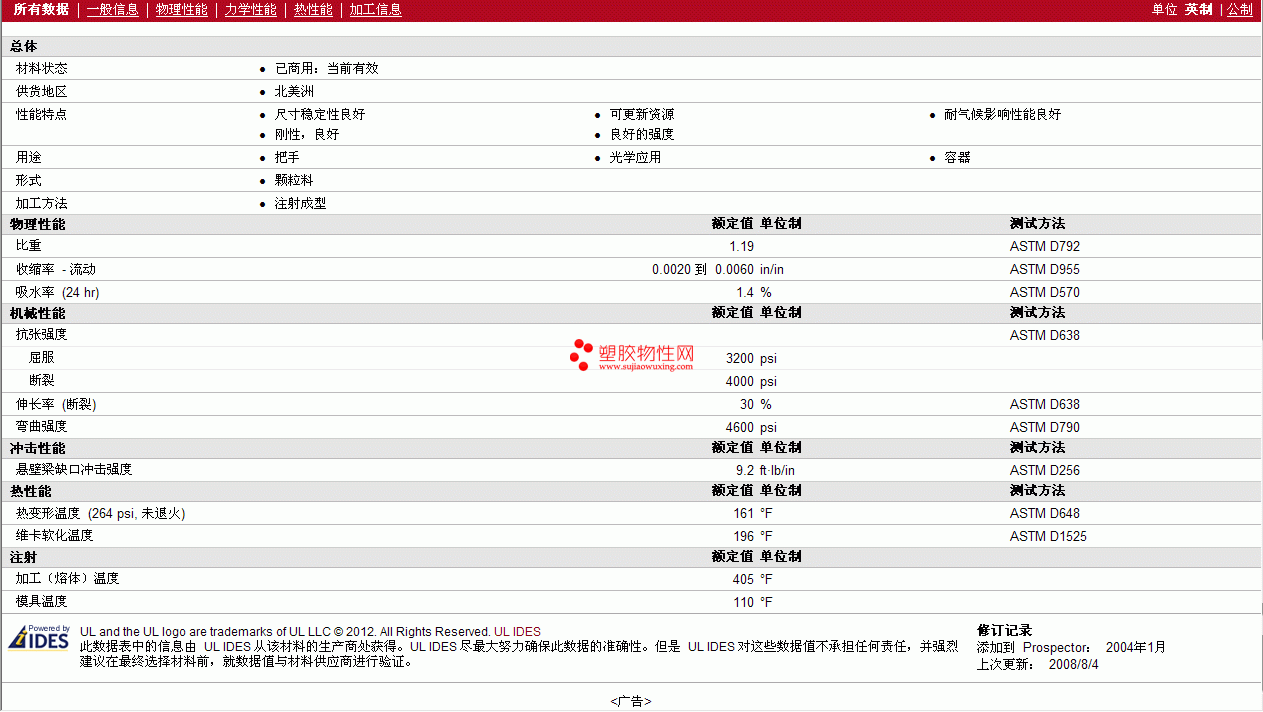 | 收缩率 - 流动 | 0.0020 到 0.0060 | in/in | ASTM D9 |