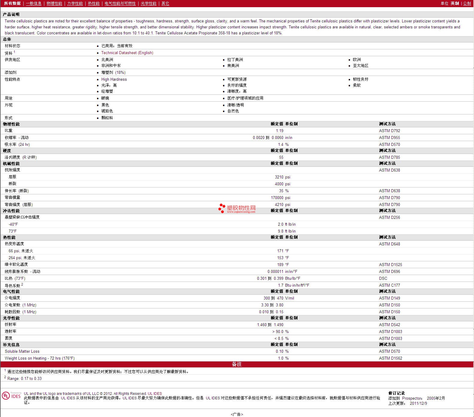 更多Tenite Propionate CAP 358A4000018 Clear, Trsp 物性表报价,图片、材质证明、UL黄卡、物质安全资料表(MSDS)等可来电咨询赵先生:13424755533或QQ: 27660005